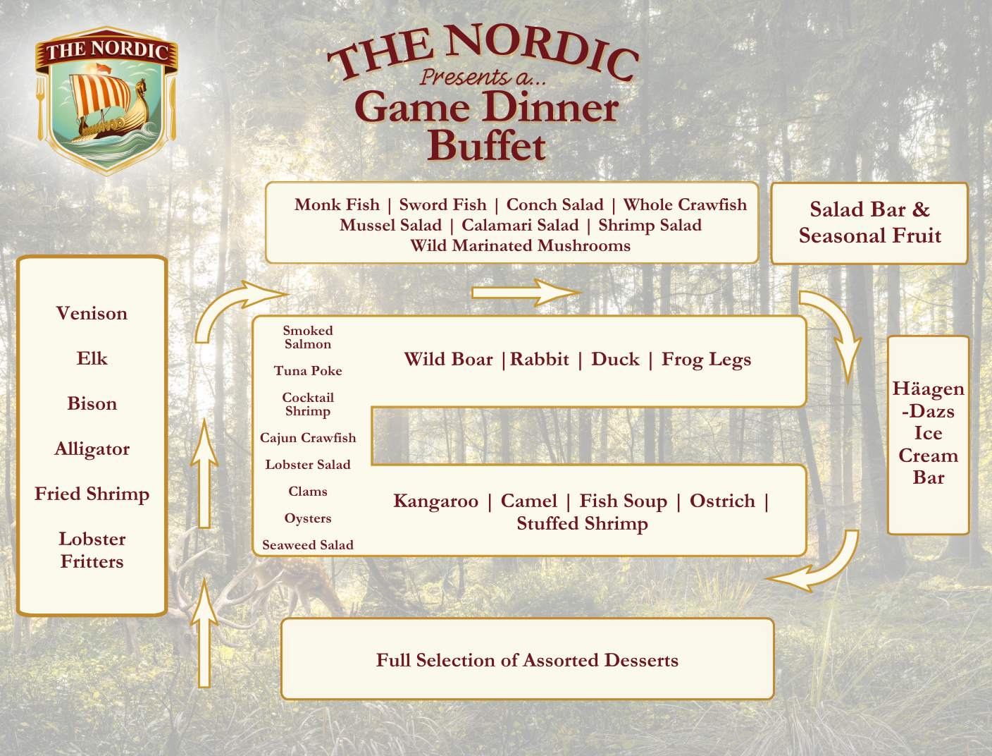 Featuring exotic game from the land and sea!Bison, Elk, Venison, Kangaroo, Alligator, Duck, full raw bar, and so much more!